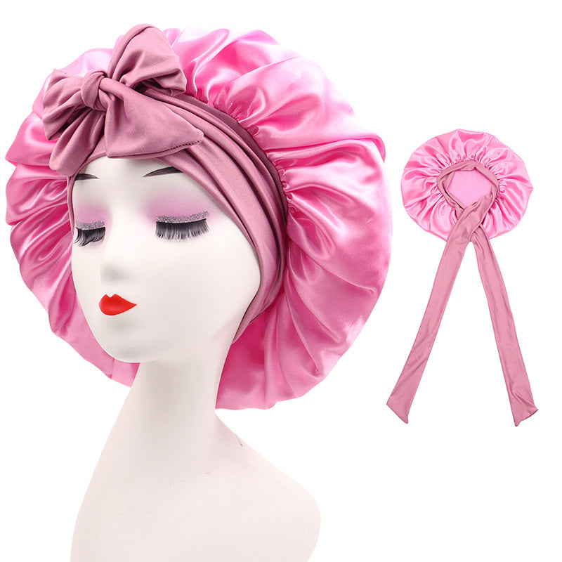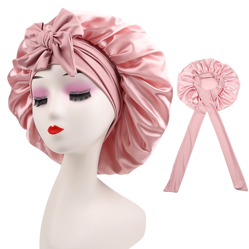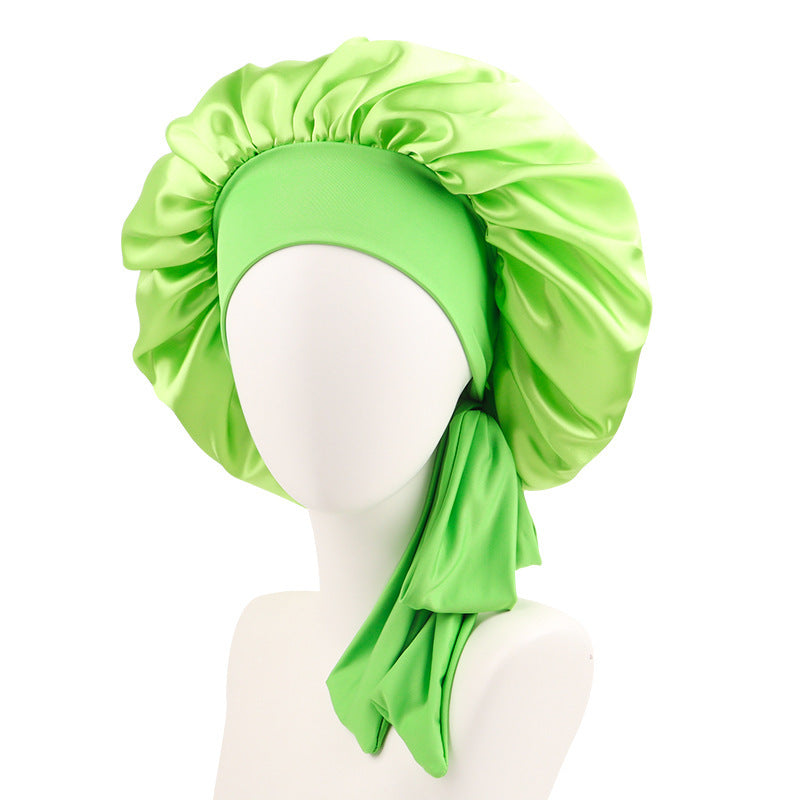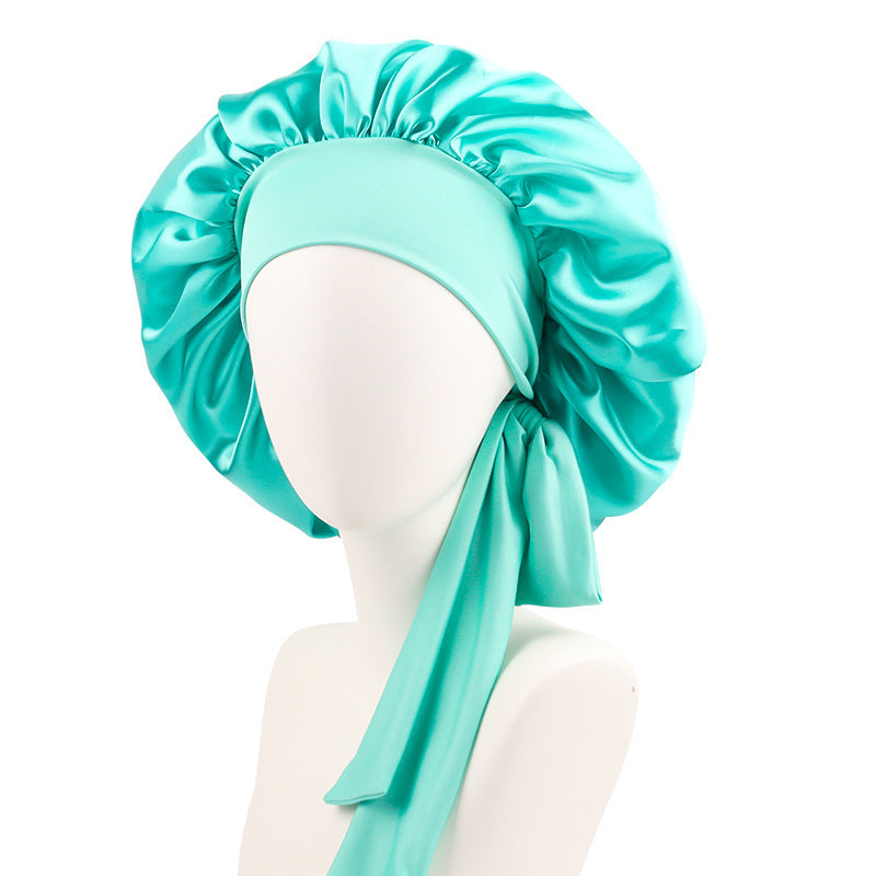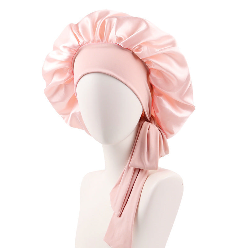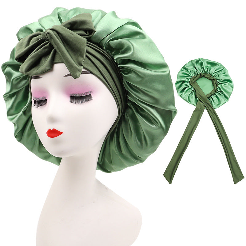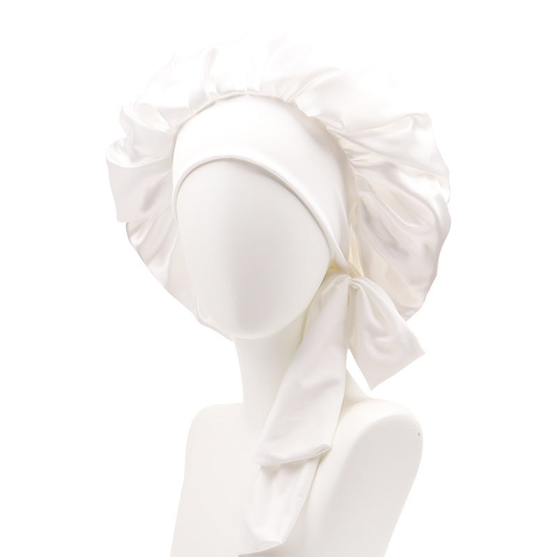 Solid Hue Women's Long Hair Satin Sleep Makeup Cap Elastic Ribbon Knotted Design