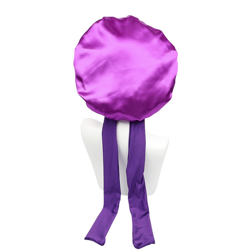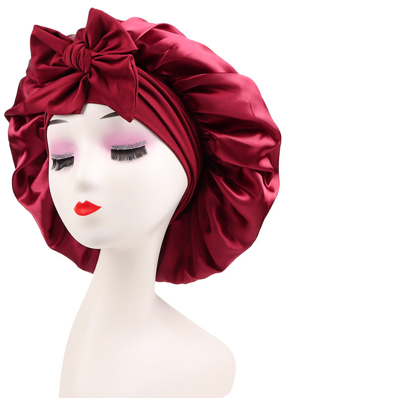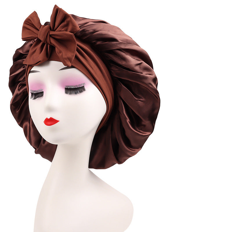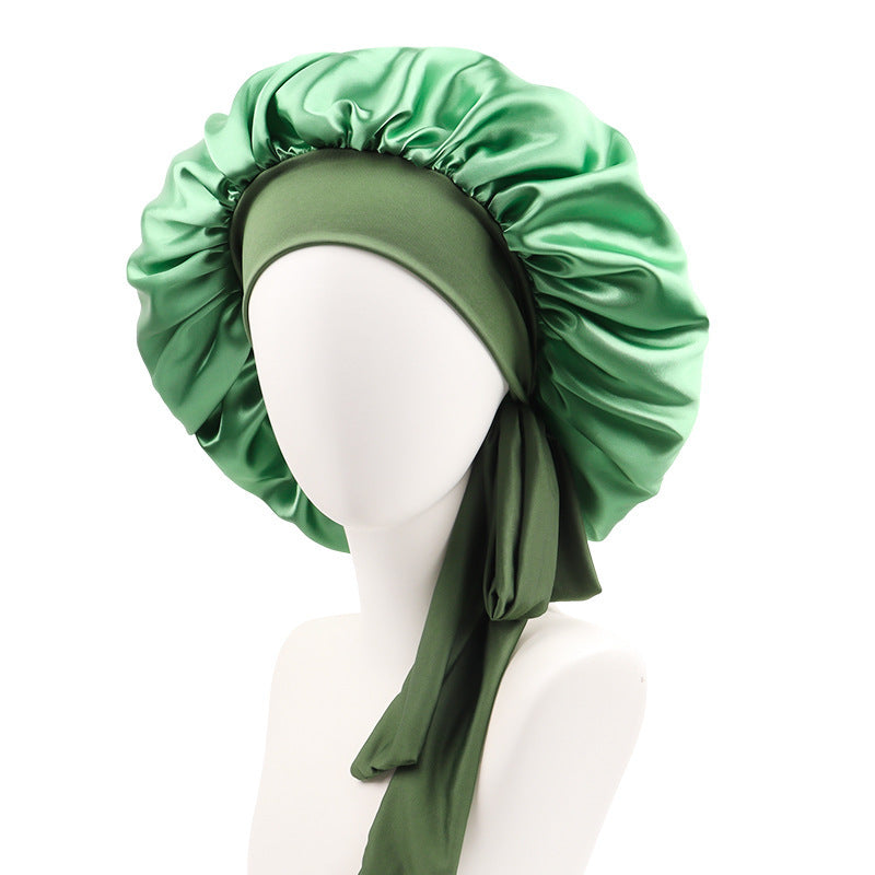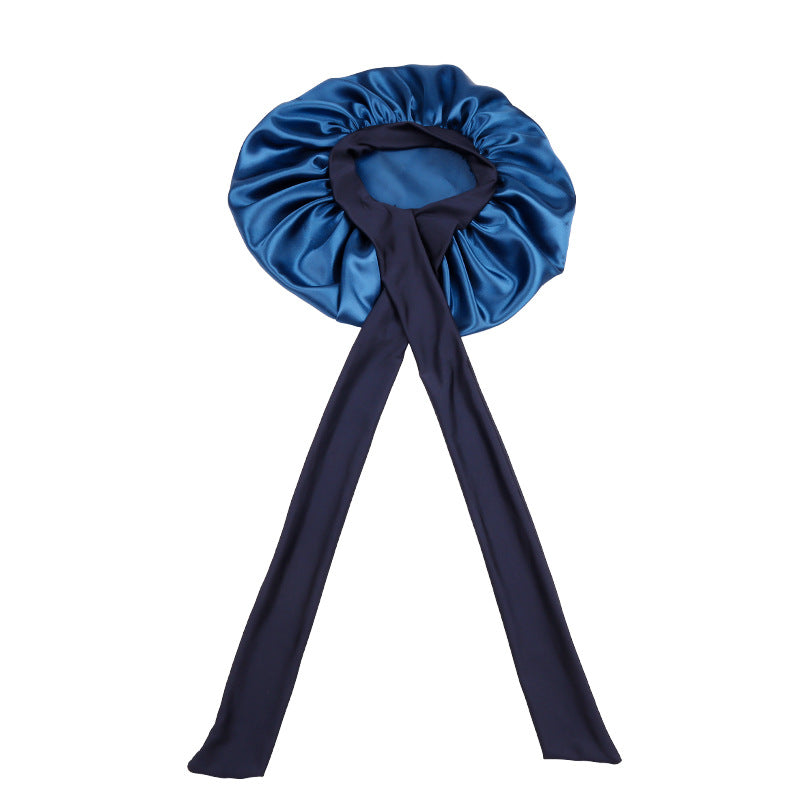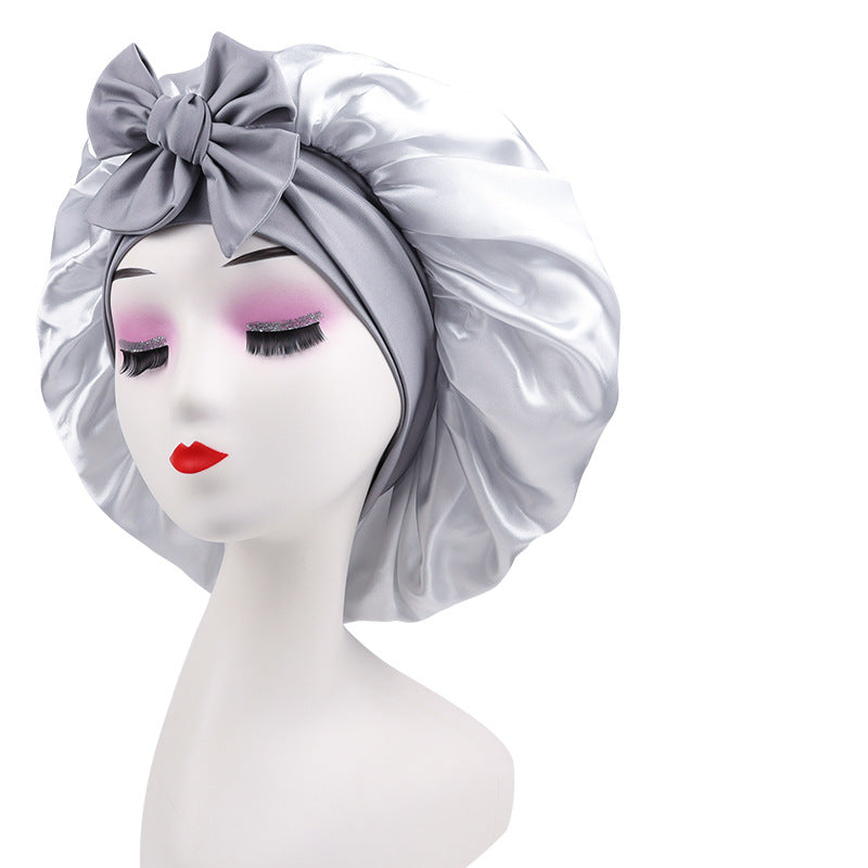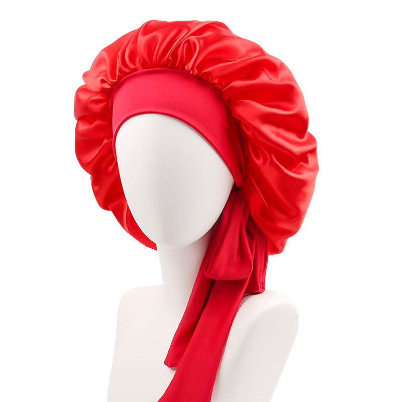 Solid Hue Women's Long Hair Satin Sleep Makeup Cap Elastic Ribbon Knotted Design