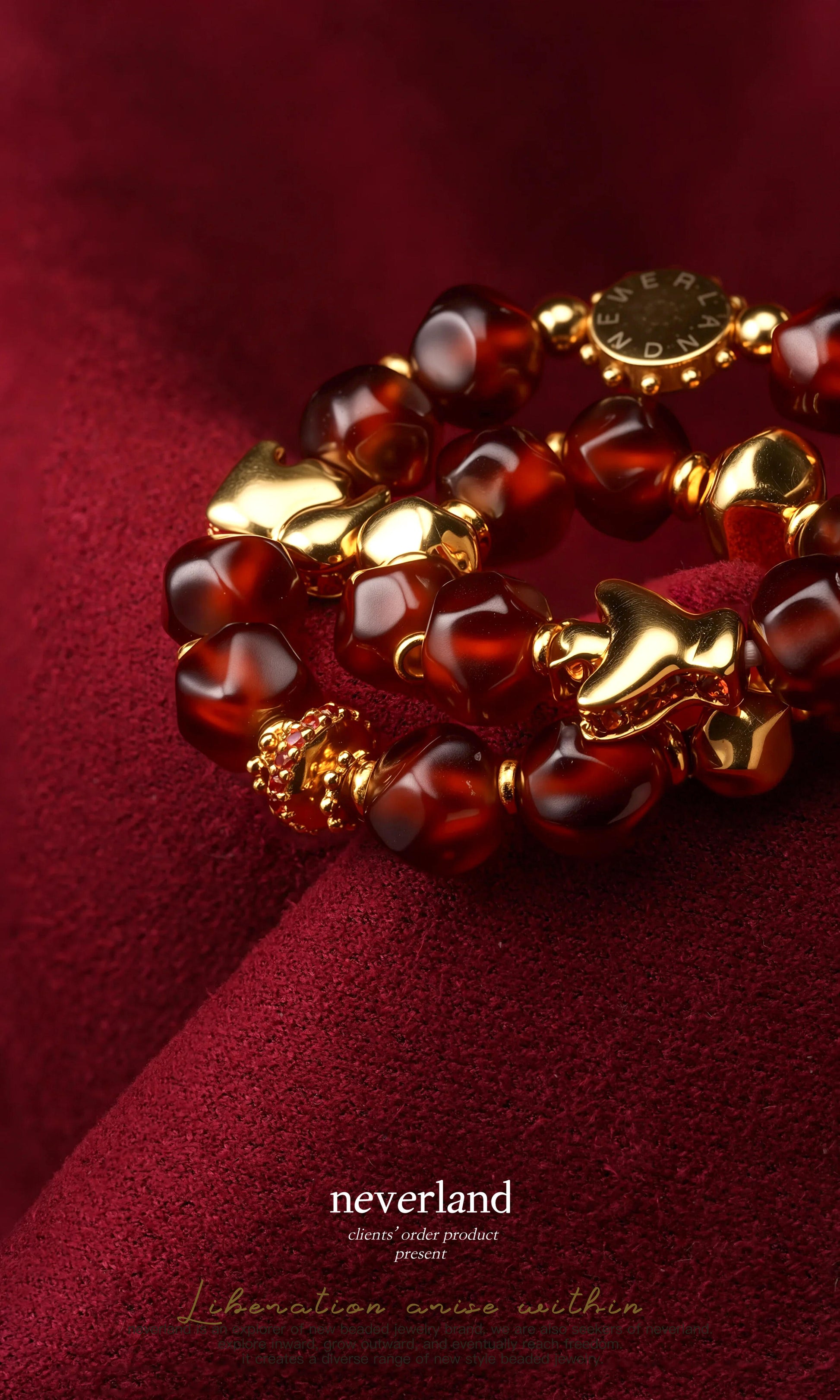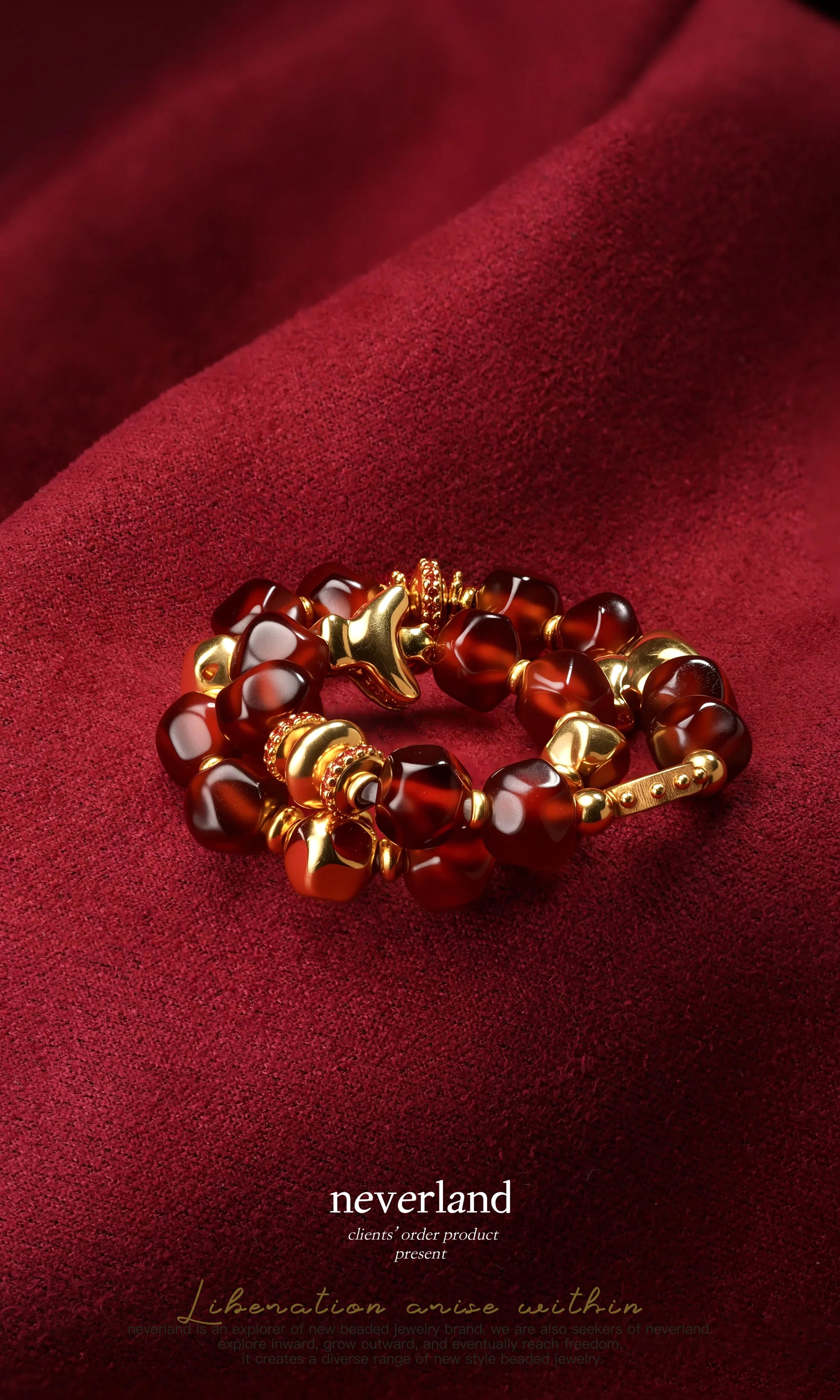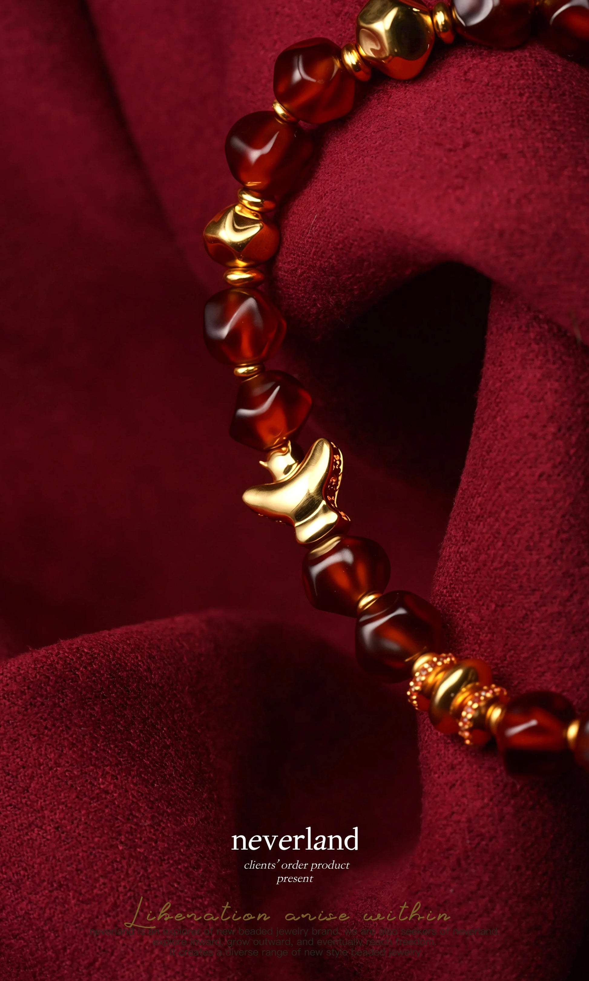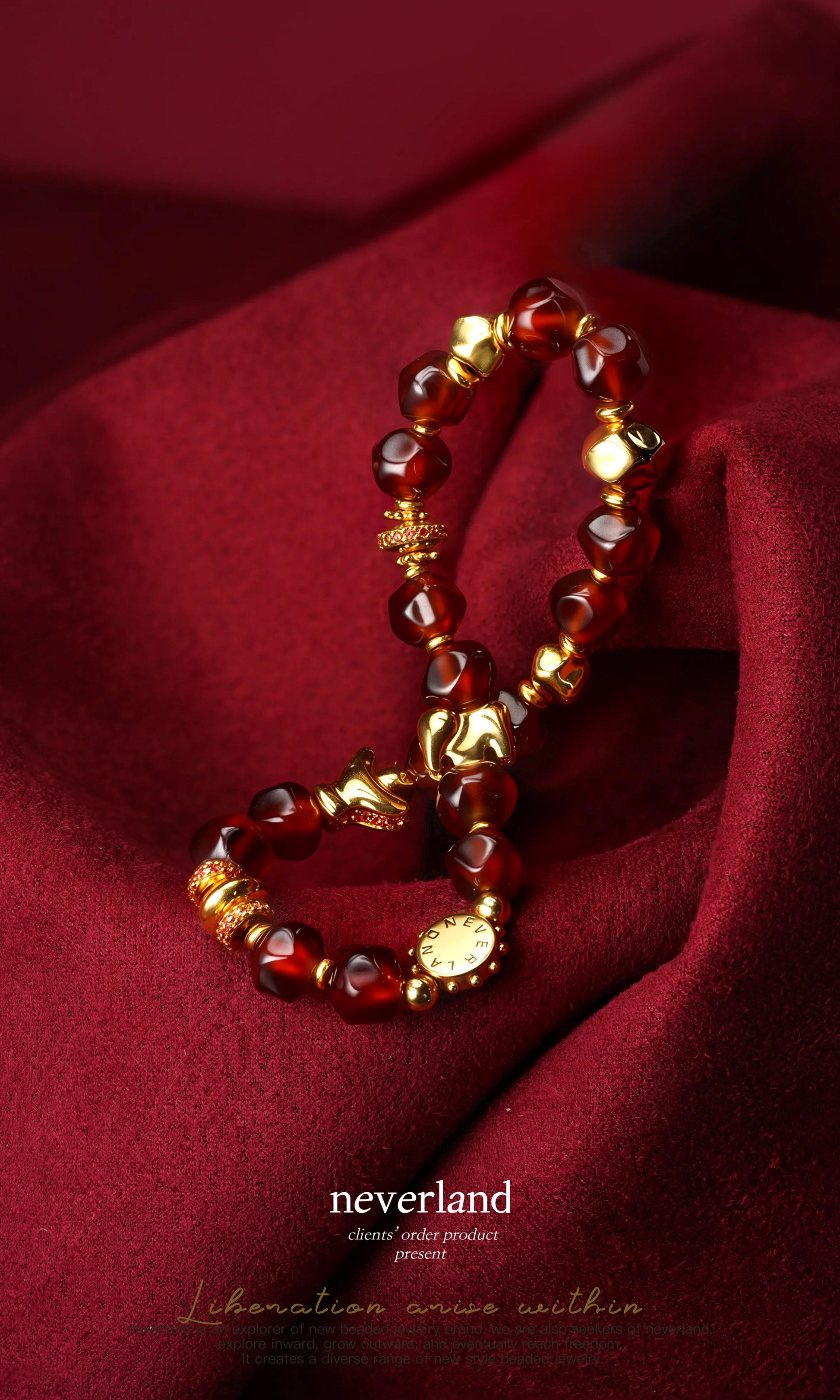 A natural red with the energy of the earth. We use natural garnet as the base and embellish it with 22K gold replicas. Paired with elephant beads and roc beads inlaid with yellow blue treasures, symbolizing wisdom and courage; UFO beads and disc beads are arranged in a staggered manner, forming an elegant and modern visual rhythm.