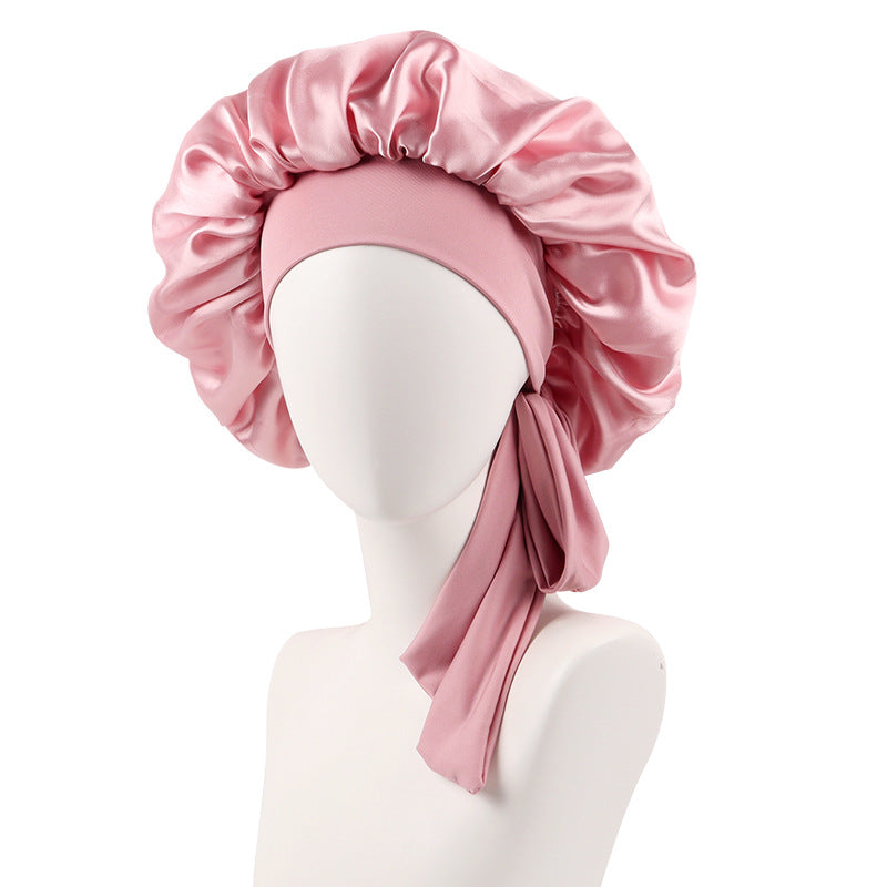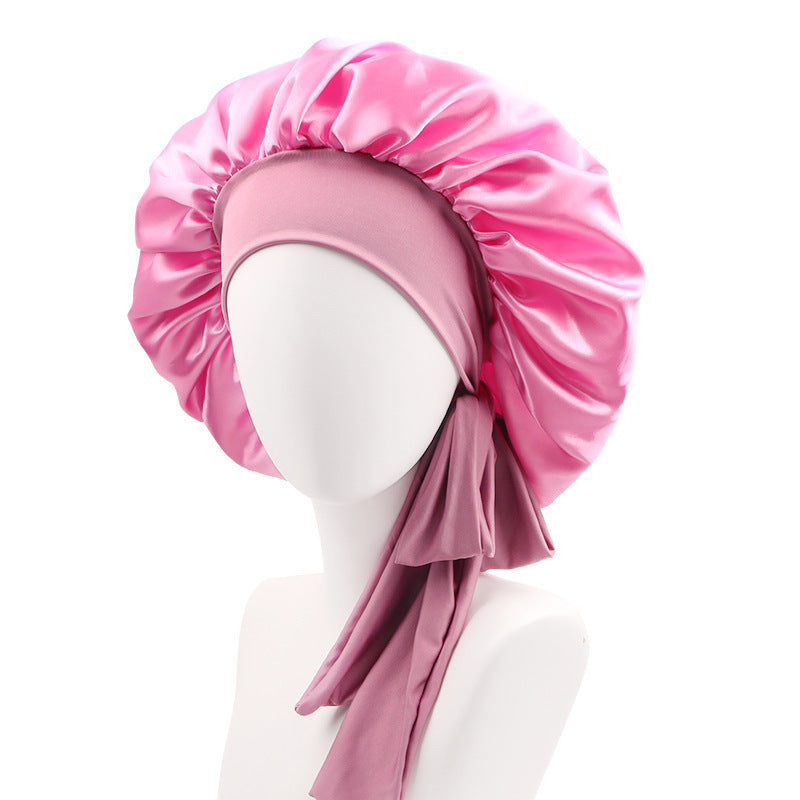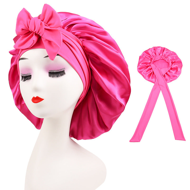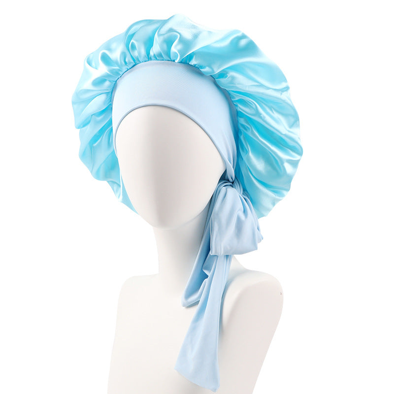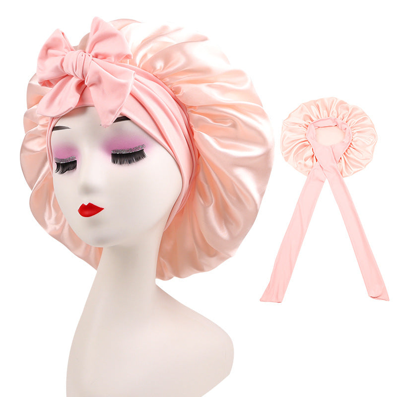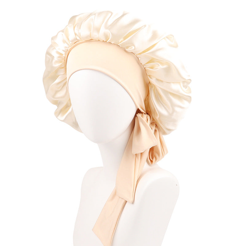 Solid Hue Women's Long Hair Satin Sleep Makeup Cap Elastic Ribbon Knotted Design